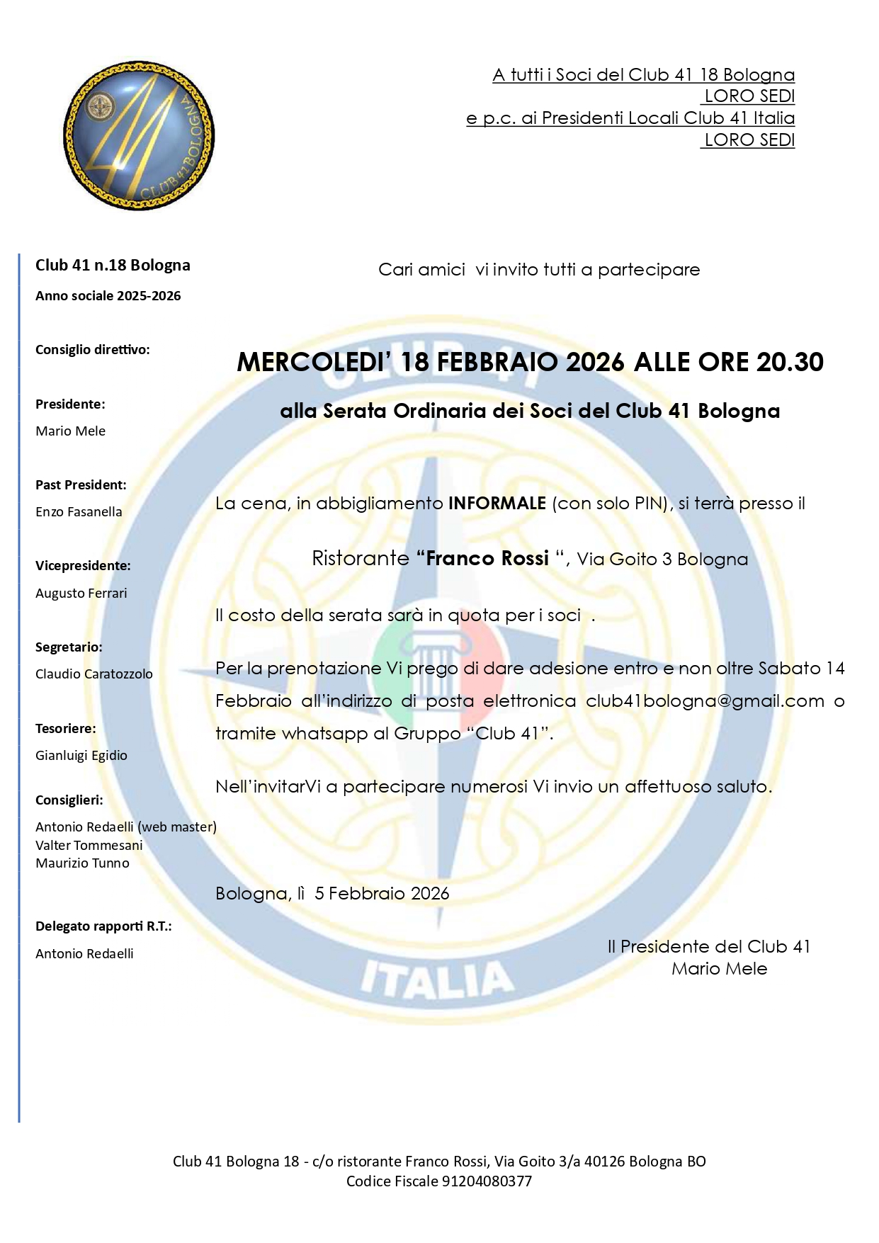 Mercoledì 18 febbraio il Club 41 Bologna si ritrova per una serata conviviale all’insegna dell’informalità. Appuntamento presso il ristorante Franco Rossi.