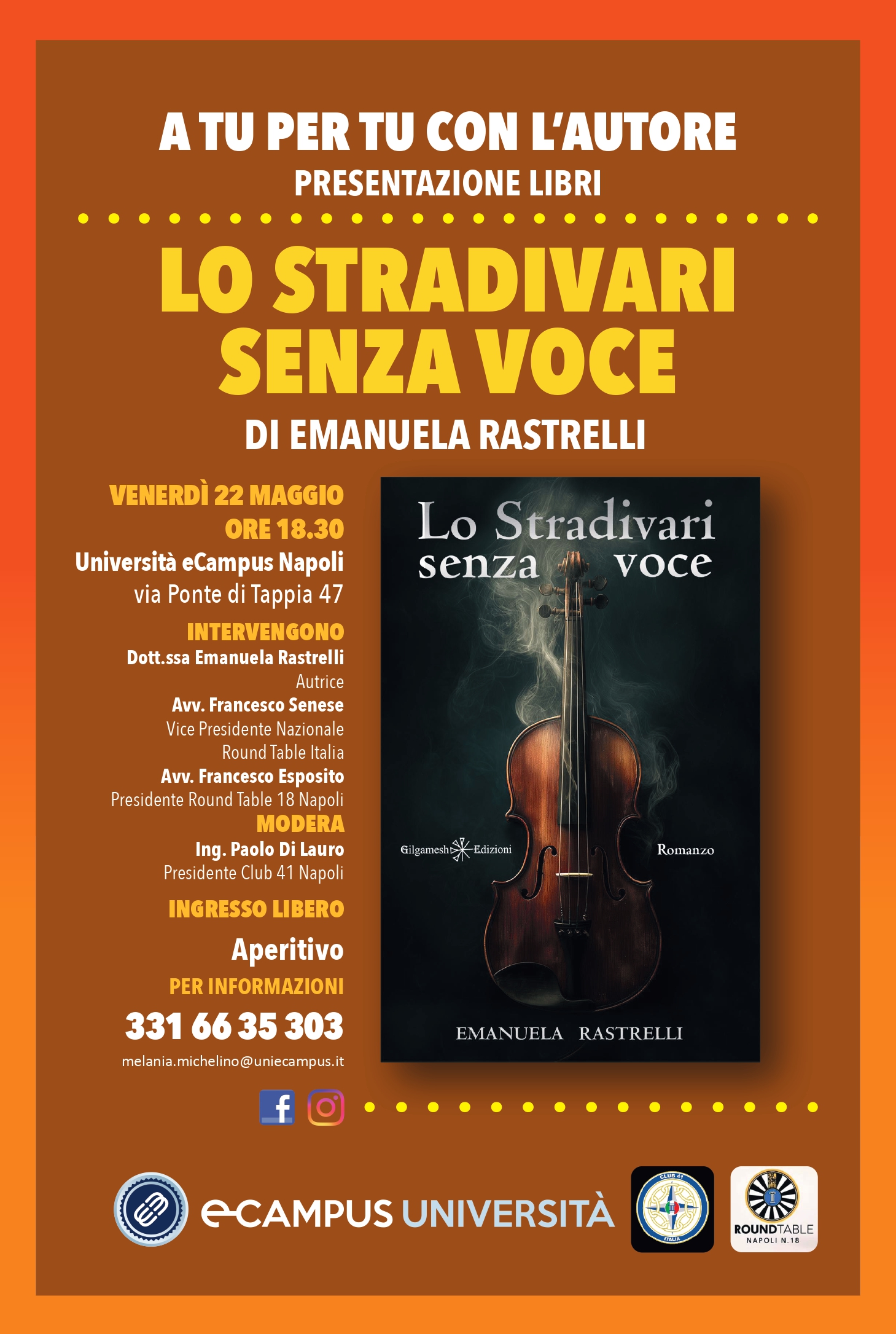 Il Club 41 Napoli ha il piacere di invitarvi alla presentazione del libro “Lo Stradivari senza voce” di Emanuela Rastrelli. Oltre all’autrice interverranno Francesco Senese, vicePresidente Round Table Italia e Francesco Esposito, Presidente Round Table 18 Napoli. A moderare l’incontro il Presidente del Club 41 Napoli Paolo Di Lauro.