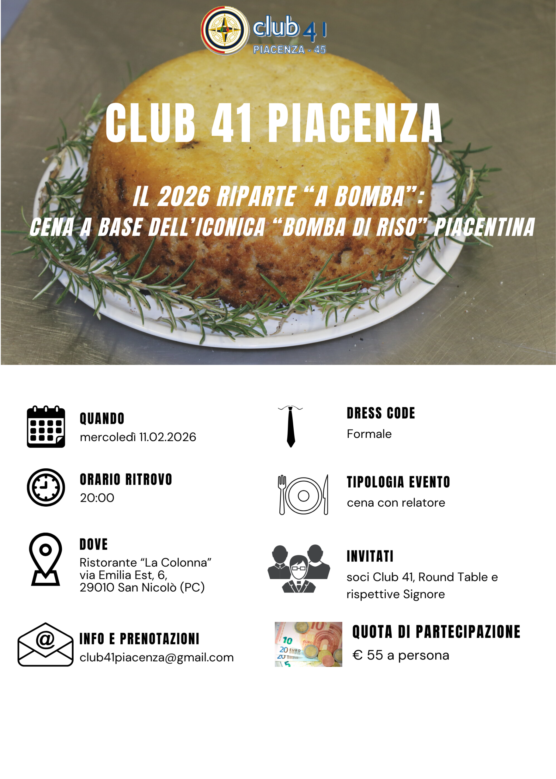Il Club 41 Piacenza riprende le serate nel nuovo anno mercoledì 11 febbraio con una serata dedicata a una specialità tipica, ma da molti poco conosciuta, quella della “Bomba di riso”.  La storia di questo piatto risale al 1600 quando, alla corte di Elisabetta Farnese, Regina di Spagna (moglie di Filippo V), l’allora Primo Ministro era un piacentino, il Cardinale Giulio Alberoni, che per compiacere la sovrana, non mancava mai di far arrivare alla tavola questo prelibato piatto, un elaborato timballo di riso con piccione, cotto al forno, contenente all’interno un intingolo saporito di carne di piccione (o talvolta funghi/animelle).