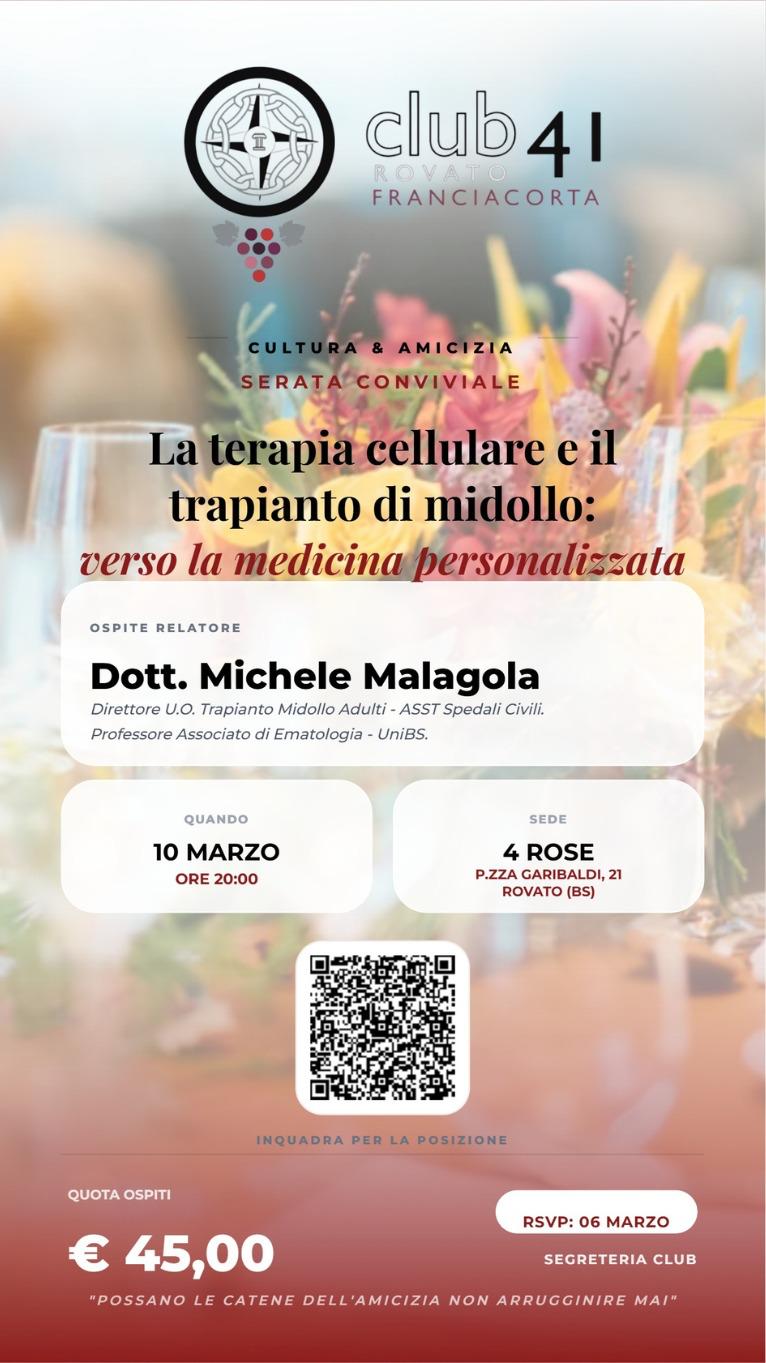 Il Club 41 Rovato Franciacorta vi invita martedì 10 marzo per una serata di grande interesse culturale a tema medico con ospite relatore il prof. Michele Malagola direttore U.O. Trapianto Midollo e professore associato di ematologia presso l’università di Brescia che affronterà il tema “La terapia cellulare e il trapianto di midollo”.